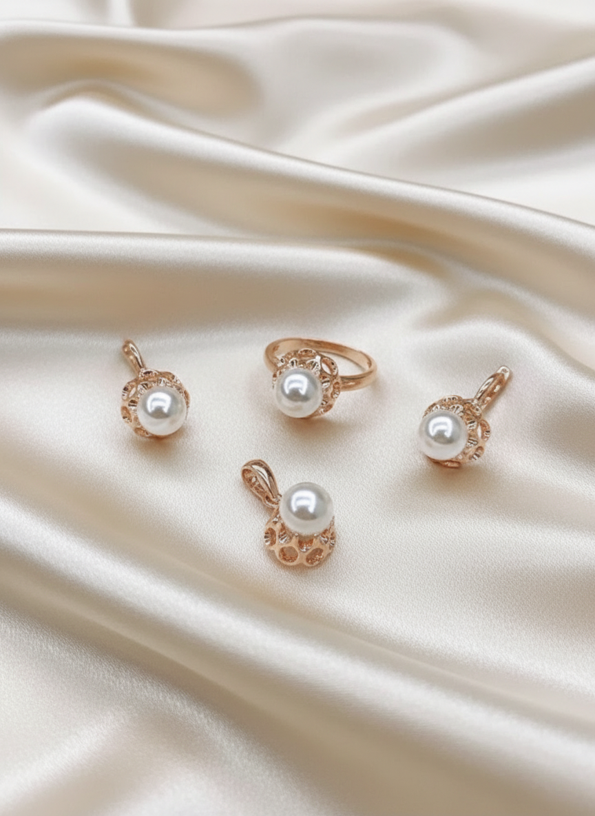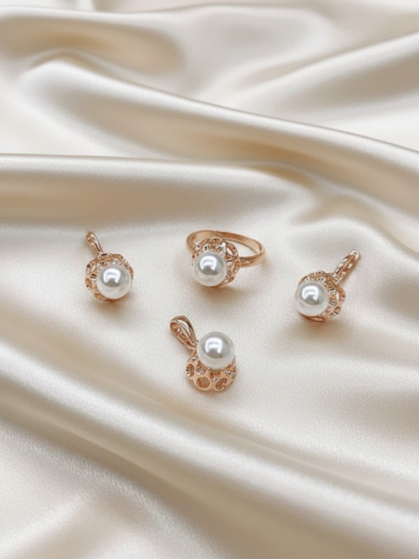 Комплект из кулона, кольца и серёг, центральной нотой которых выступает нежная перламутровая жемчужина, невероятно притягателен и изыскан. Золотистое кружево изделий подчёркивает таинственное мерцание камней, добавляя аксессуарам индивидуальности. Такой комплект станет незаменимым для придания завершённости вечернему образу.