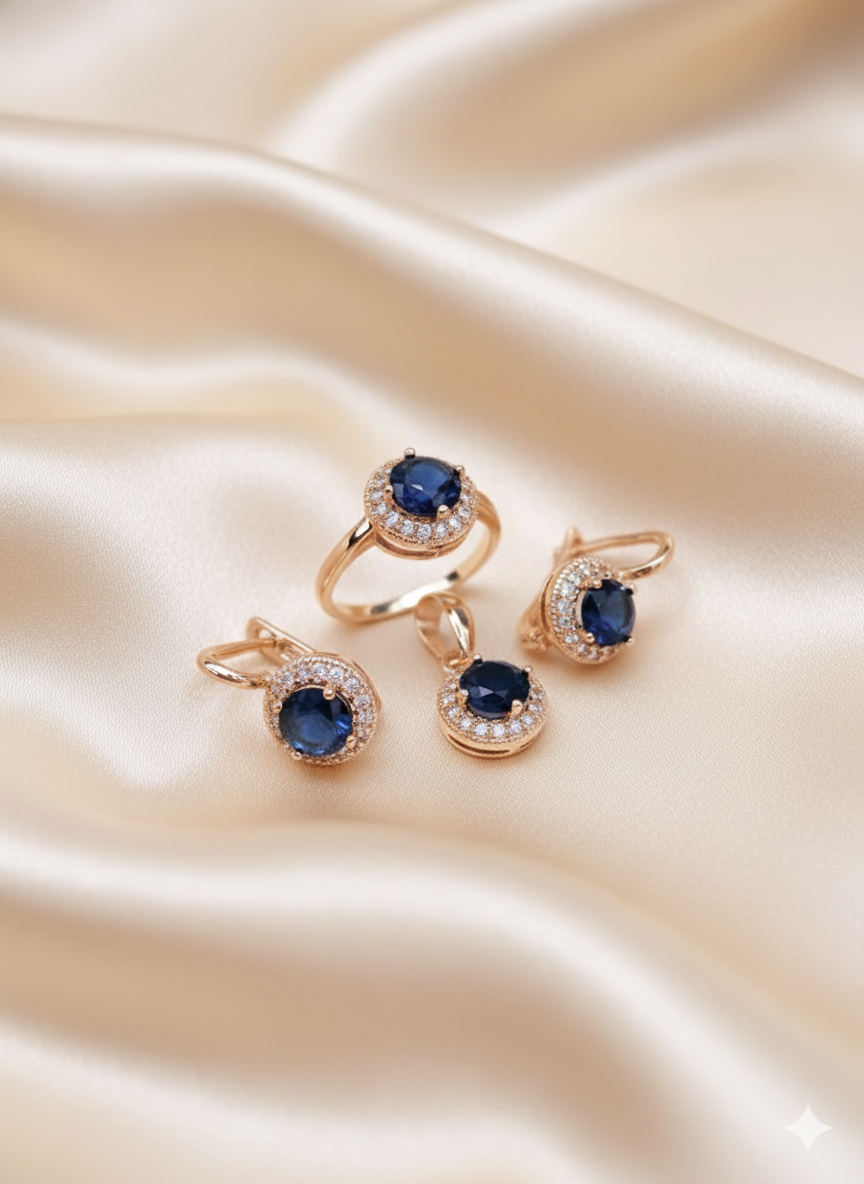 Яркие синие минералы, украшающие комплект из серёг, кулона и кольца - что может быть прекраснее и притягательнее? Классическая форма изделий и невероятные переливы крошечных и крупных минералов, создают идеальный ювелирный тандем, способный выделяться на фоне множества украшений. Хотите затмить всех на праздничном вечере своей индивидуальностью и роскошным обликом? Такой комплект вам непременно в этом поможет.