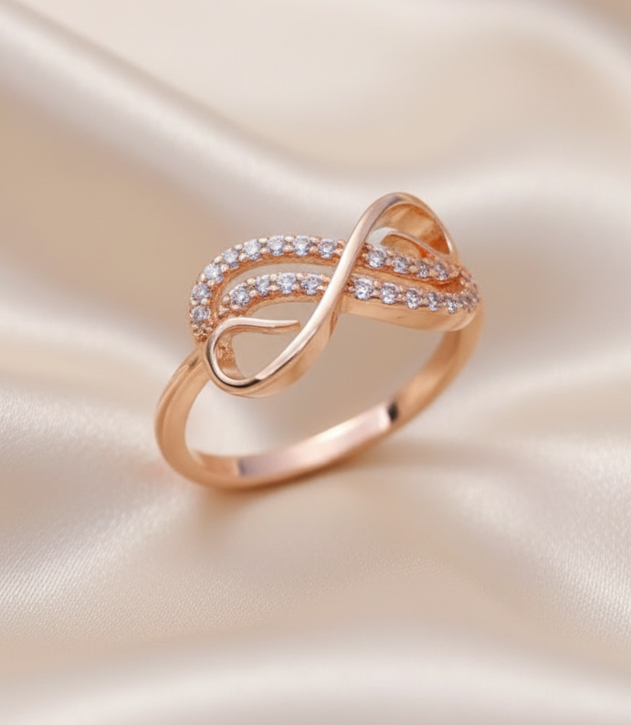 При взгляде на это кольцо, каждый найдёт для себя свой неповторимый образ. Изогнутые плавные линии, украшенные россыпью минералов складывают собой знак бесконечности. Бесконечно красивое и нежное кольцо, будет радовать вас изо дня в день и обязательно привлечёт к вашим рукам заинтересованные взгляды.